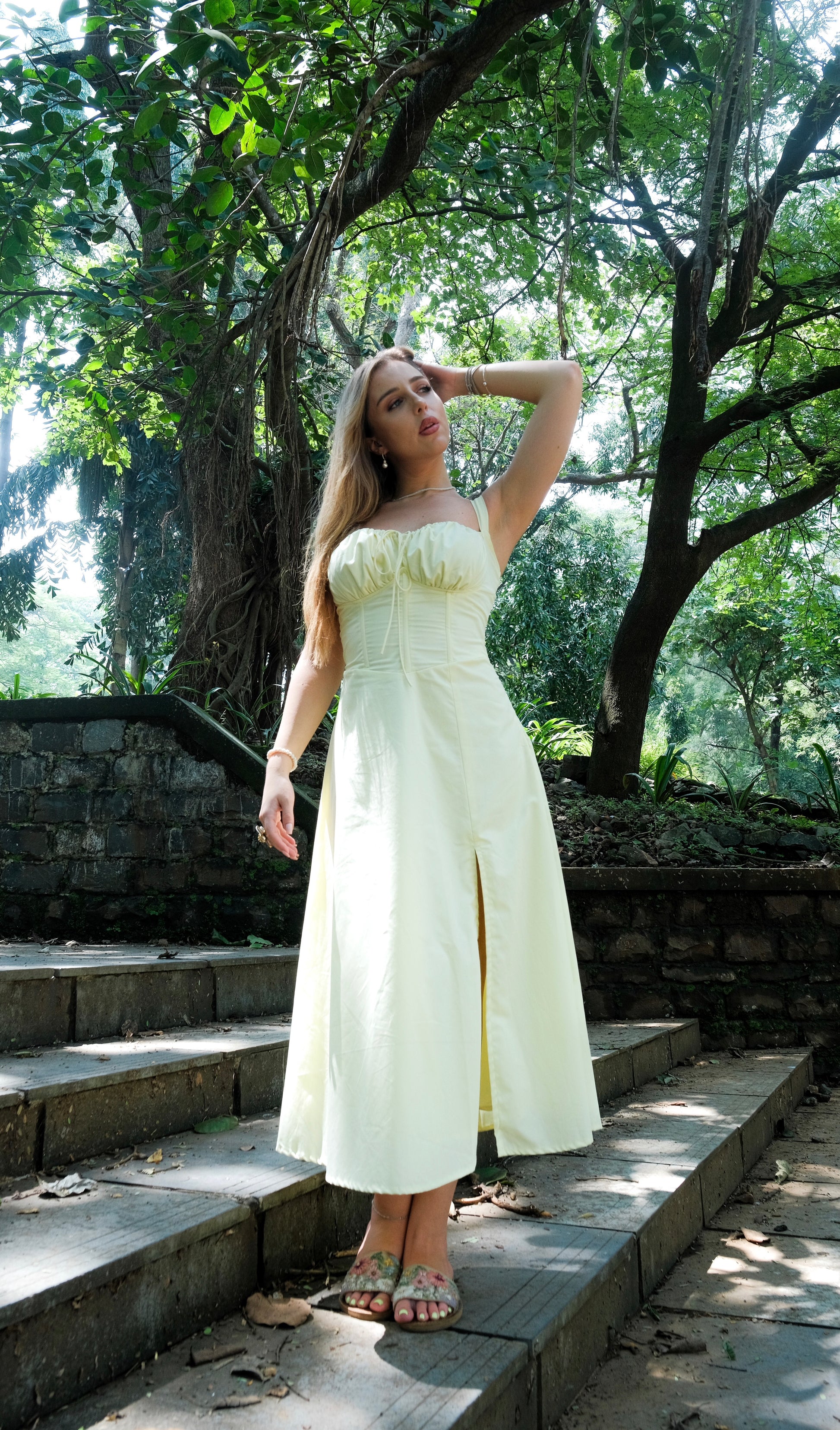 This butter yellow, double-lined midi dress is the perfect blend of elegance and comfort, making it a versatile choice for a range of occasions. Crafted from high-quality, breathable fabric, the dress features a flattering square neckline with a delicate gathered bust, tied at the center with a dainty bow for a feminine touch. The bodice is designed with subtle corset-style seam detailing to enhance the natural silhouette, offering structure while maintaining a soft, flowing fit.